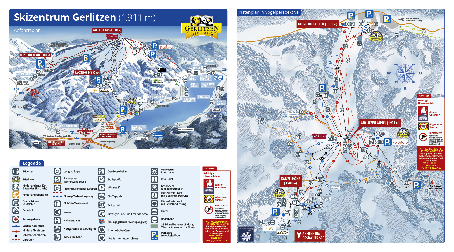 The Gerlitzen is a small mountain community made up of several hotels, restaurants and bars at a height of just over 1500m. It can be reached via gondola from Annenheim on Lake Ossiach (which is only 4km from Villach) and by road from Klösterle. Well prepared slopes offer great skiing for all levels of skier and boarder. A modern and efficient lift system keeping queuing to a minimum. Wide slopes with great progression for beginners and intermediates with some challenging skiing for the more advances skiers. Fantastic for "carving"!